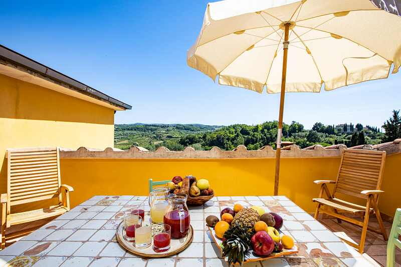 Es gibt acht Doppelzimmer mit jeweils eigenem Bad. Zwei große Terrassen mit herrlicher Aussicht und Saal für Frühstück und Abendessen (kein öffentliches Restaurant) gehören zum Weingut. Um die fantastische Küche kümmern sich die Damen des Hauses und verwenden dabei vorwiegend hauseigene Produkte.