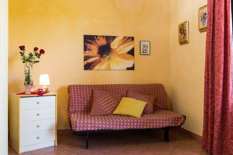 Die Ferienwohnung Ciliegia (50 m²) hat einen Schlafraum, eine Doppelschlafcouch im Wohnraum, dazu Küche, Bad und eine eigene Terrasse.