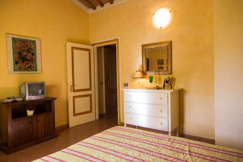 Die Ferienwohnung „Ciliegia“ (deutsch Kirsche) liegt im 1. Stock des gelben Landhauses (zum Agriturismo gehören zwei Bauernhäuser) und hat somit eine gute Privatsphäre. Sie ist 50 m² groß und mit Holzbalkendecken im typisch toskanischen Stil eingerichtet. Sie verfügt über ein Schlafzimmer und einen Wohnbereich/ Küche mit komfortabler Schlafcouch. Man blickt vom Balkon in den Garten, auf den Pool und den Hügel wo Lari mit seinem imposanten Castello liegt, das man auf einem kurzen Spaziergang bequem erreicht. Das Castello kann man auch besichtigen, ebenso wie die kleine aber weltberühmte Nudelfabrik Martelli, die am Fuße des Castellos liegt. Im diesem toskanischen Agriturismo kann man wunderbar essen. Die Familie kocht selbst und bemüht sich tagein tagaus um das Wohl ihrer Gäste.