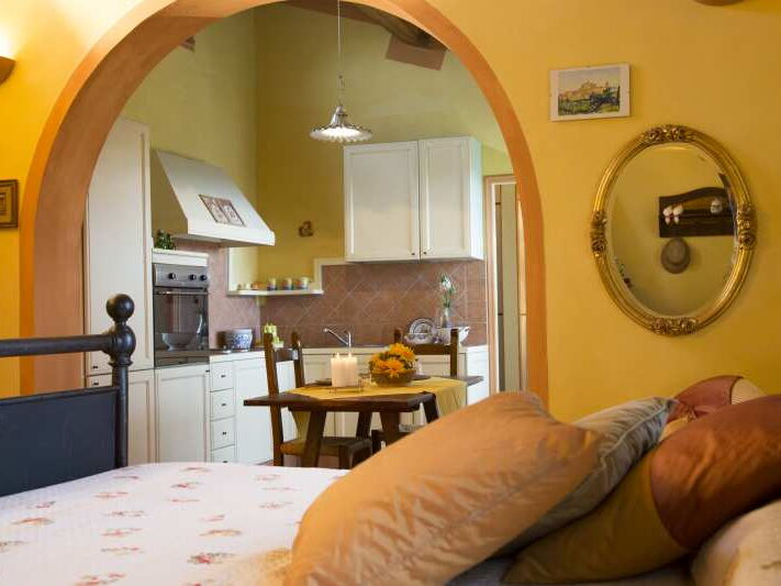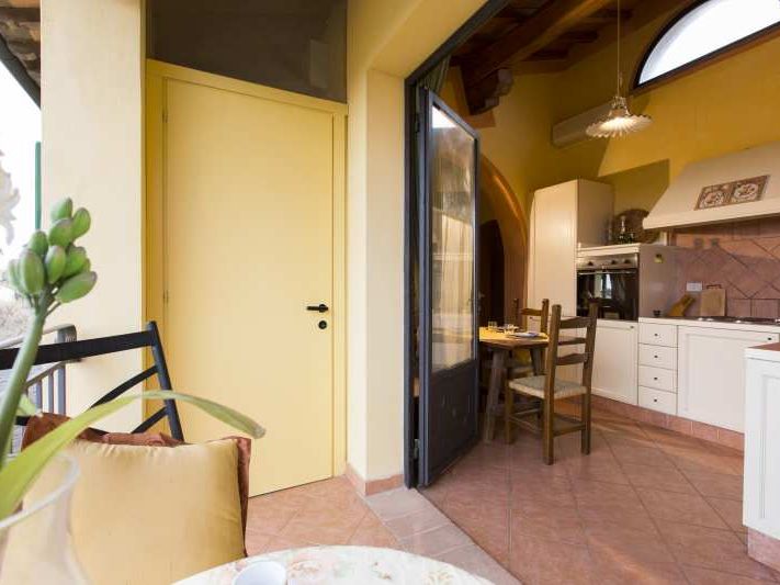 Das Apartment „Melagrano“, Granatapfel, liegt neben dem Apartment Ciliega im ersten Stock eines gelben Landhauses. Es ist eine sehr hübsche Ferienwohnung im Stil "open space", ca. 40 m², mit einem großen Raum mit Doppelbett, Küchenzeile und Balkon mit sehr schöner Aussicht in die toskanischen Hügel nach Lari.