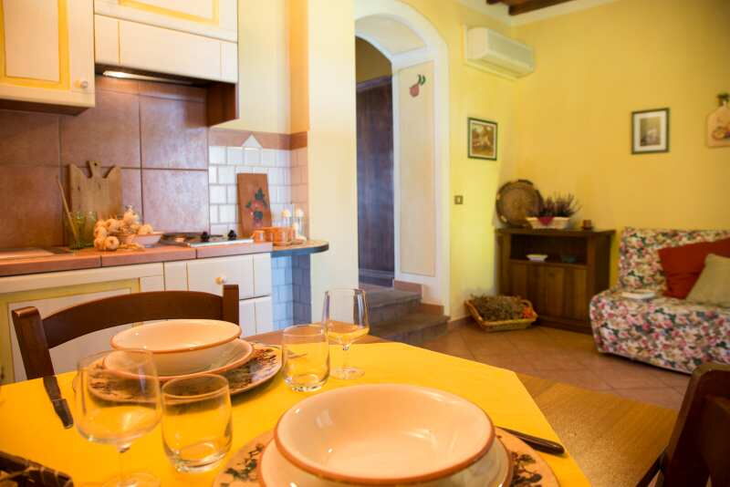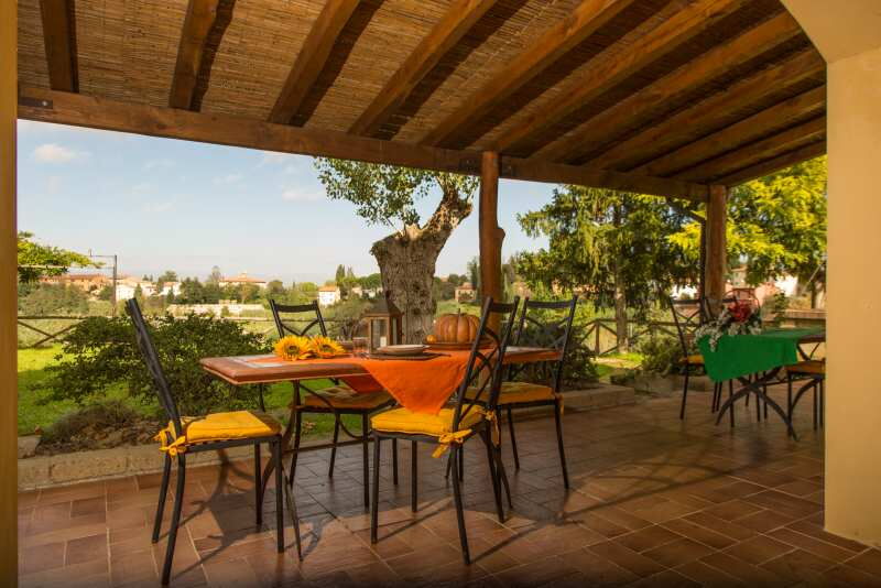 Die Ferienwohnung „Mela“ (deutsch Apfel) liegt im Mittelteil des gelben Landhauses, das zum hübschen Agriturismo mit zwei geschmackvollen Landhäusern am Dorfrand von Lari gehört. Zur Ausstattung gehört eine eigene überdachte Terrasse, die vor zu viel Sonne (kann im Süden passieren) schützt. Der Blick von der Terrasse geht in den Garten, auf Zypressen, Olivenbäume und Kirschbäumen. Ein wunderbarer Ort für einen komfortablen, entspannten Bauernhaus-Urlaub in der Toskana. Im hauseigenen Restaurant wird fantastisch gekocht und vom Pool aus hat man einen Panoramablick in die Landschaft. Das Zentrum von Lari erreicht man bequem zu Fuss. Ein sehr schönes Ambiente, das zum Entspannen einlädt, mit allem Komfort, den man sich wünscht.