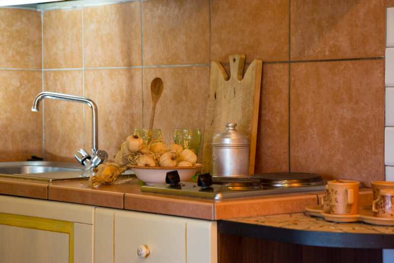 Die Ferienwohnung Mela (50 m²) besitzt einen Schlafraum, eine Doppelschlafcouch im Wohnraum, dazu Küche, Bad und eine eigene Terrasse.