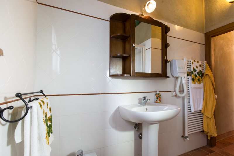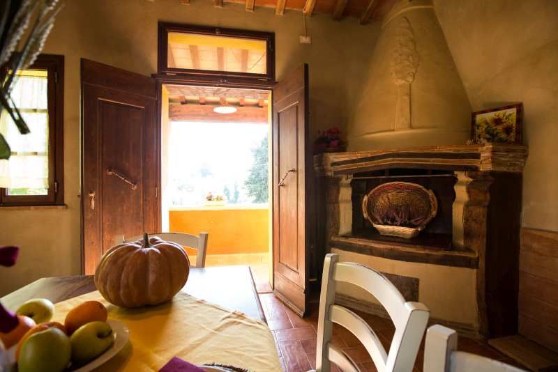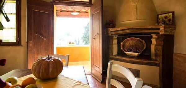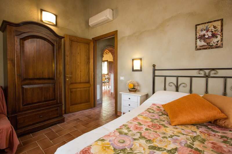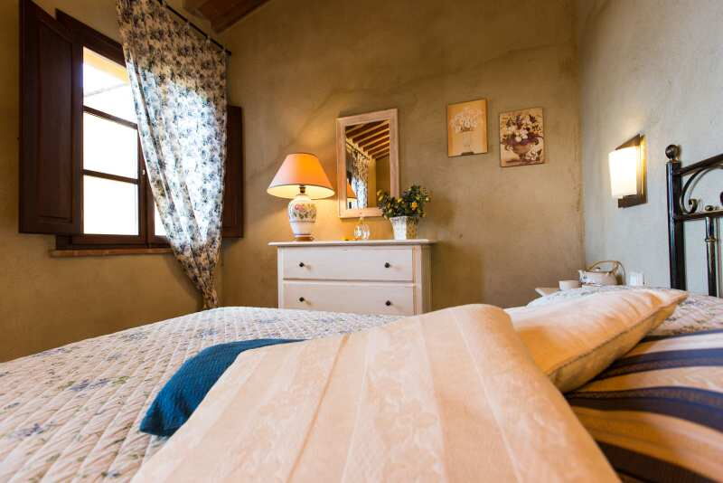 Die große Ferienwohnung „Nespola“ (deutsch Mispel) verfügt über 3 Doppelschlafzimmer und 2 Bäder, dazu im Wohnraum/ Küche ein Schlafsofa für eine weitere Person, und liegt im 1. Stock des roten Hauses und gehört zu einem hübschen Agriturismo mit zwei geschmackvollen Landhäusern am Dorfrand von Lari. Zur Ausstattung gehört eine eigener großer Essplatz im Garten. Die Wohnung mit 100 m² hat auch einen Kamin in der Küche. Der Blick von den Zimmern geht auf Lari mit dem abends beleuchteten Castello, Zypressen und den Obstgarten. Ein wunderbarer Ort für einen komfortablen, entspannten Bauernhaus-Urlaub in schöner Natur in der Toskana. Im hauseigenen Restaurant wird fantastisch gekocht. Der Pool bietet einen schönen Panoramablick in die Landschaft.