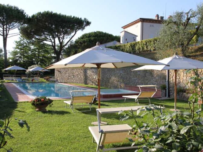 Um das Haus herum, eingebettet im Grün der Pinien und Zypressen, breitet sich ein 8 ha grosser Park aus. Er besteht teils aus Wiesen, teils aus Wald mit Spazierwegen, Oliven- und Obstpflanzungen und Weinbergen. Die günstige Lage der Villa ermöglicht es, die Strände und die Lokale der Versilia, die Küsten von Pisa, Livorno und die Insel Elba aufzusuchen. Das Gelände liegt nur 8 km von der Schnellstraße Florenz-Pisa-Livorno (Fi-Pi-Li), über die man die wichtigsten Kunststädte der Toskana erreichen kann. Pisa (20 km), Florenz (60 km), Lucca (37 km), Siena (70 km), Volterra (35 km), S. Gimignano (30 km)....